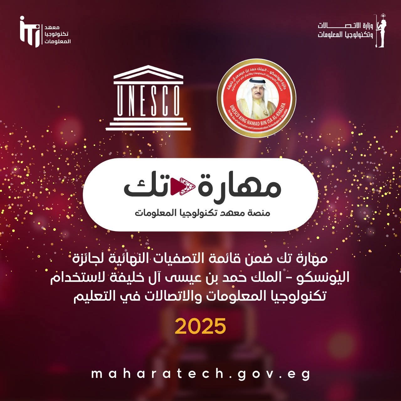 أعلنت وزارة الاتصالات وتكنولوجيا المعلومات عن اختيار منصة “مهارة تك” التعليمية التابعة لـ معهد تكنولوجيا المعلومات (ITI)، ضمن القائمة النهائية لجائزة اليونسكو – الملك حمد بن عيسى آل خليفة لاستخدام تكنولوجيا المعلومات والاتصالات في التعليم لعام 2025، بعد ترشيحها رسميًا من اللجنة الوطنية المصرية لليونسكو.