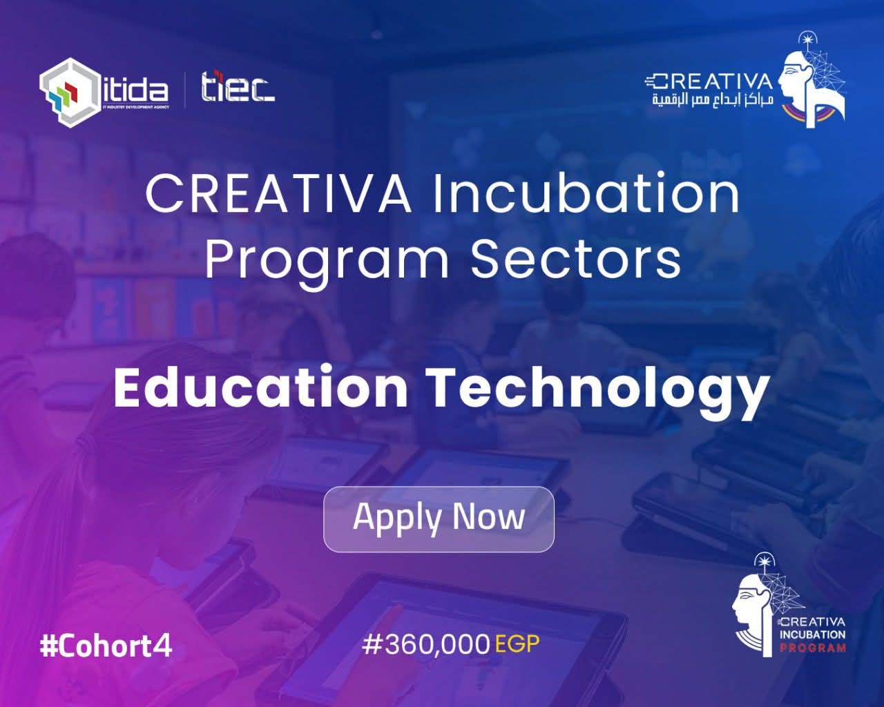 «Creativa Innovation Hubs» are accepting applications for the fourth cohort of Creativa Incubation Program (CIP), organized in collaboration between the Technology Innovation and Entrepreneurship Center (TIEC) and operators of «Creativa Innovation Hubs» in each governorate.