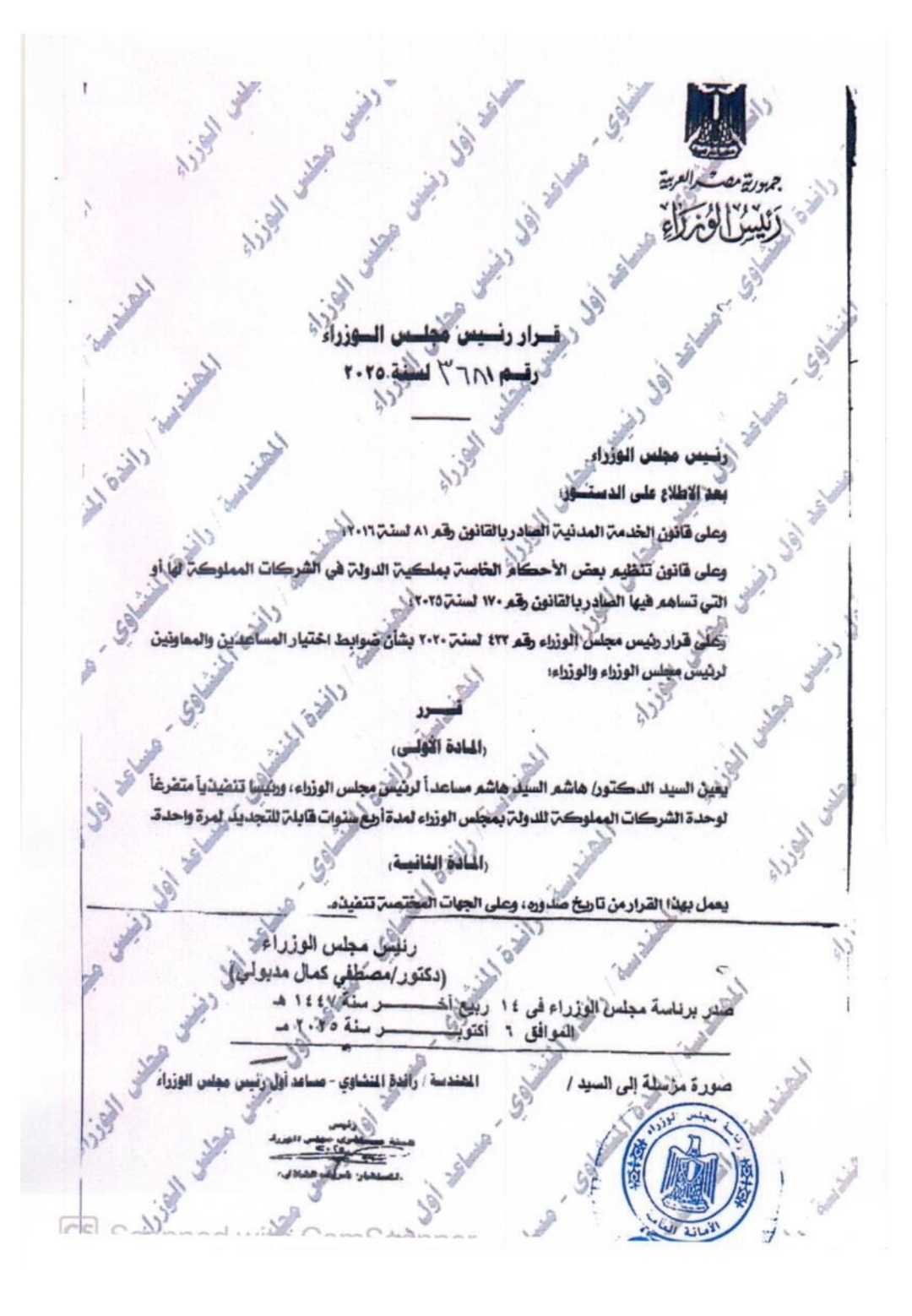 أصدر الدكتور مصطفى كمال مدبولي، رئيس مجلس الوزراء، المصري قرارا رقم 3681 لسنة 2025، بتعيين الدكتور هاشم السيد هاشم مساعدًا لرئيس مجلس الوزراء، ورئيسًا تنفيذيًا متفرغًا للوحدة المركزية لمتابعة الشركات المملوكة للدولة بمجلس الوزراء، وذلك لمدة أربع سنوات قابلة للتجديد لمرة واحدة.