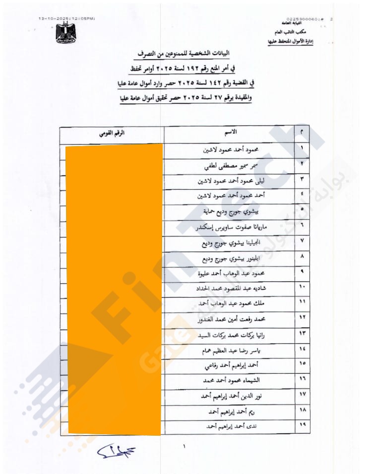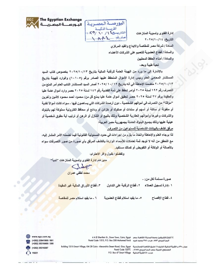 وجاء القرار الذي حصلت بوابة «فنتيك جيت FinTech Gate» بناءً على ما ورد من الهيئة العامة للرقابة المالية المصرية بتاريخ 13 أكتوبر 2025، في ضوء كتاب السيد المستشار المحامي العام رئيس إدارة الأموال المتحفظ عليها رقم (10105)، الذي تضمن الإشارة إلى صدور الأمر المشار إليه بتاريخ 12 أكتوبر 2025.