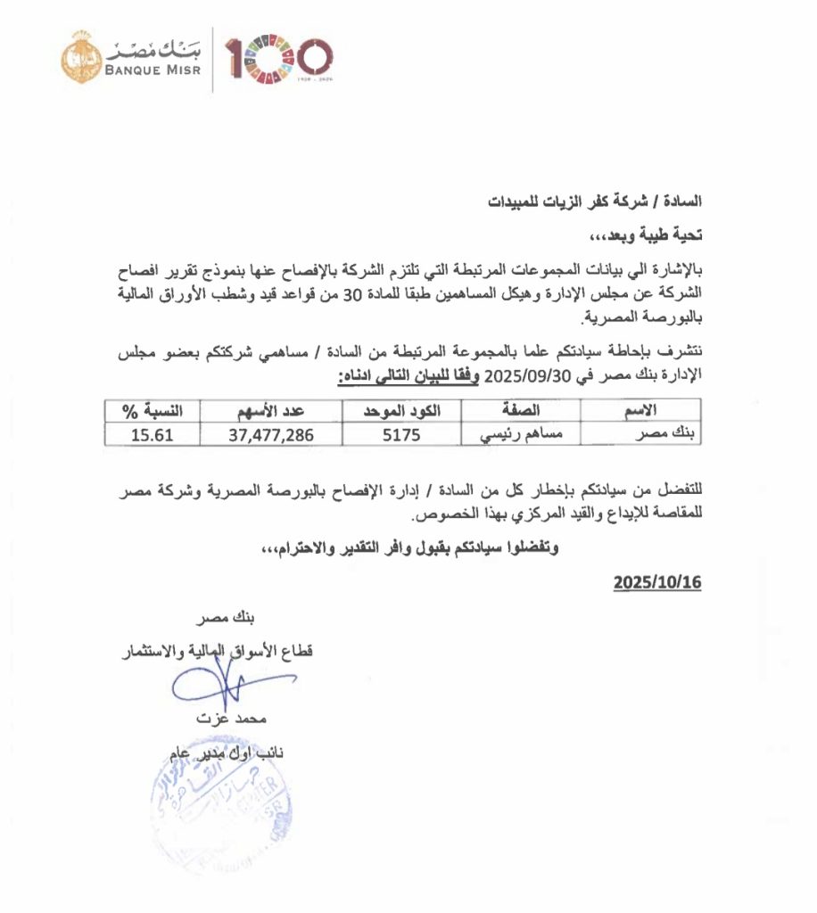 أعلنت شركة كفر الزيات للمبيدات عن استحواذ بنك مصر على حصة قدرها 15.61% من رأسمال الشركة، بما يعادل 37.477 مليون سهم.