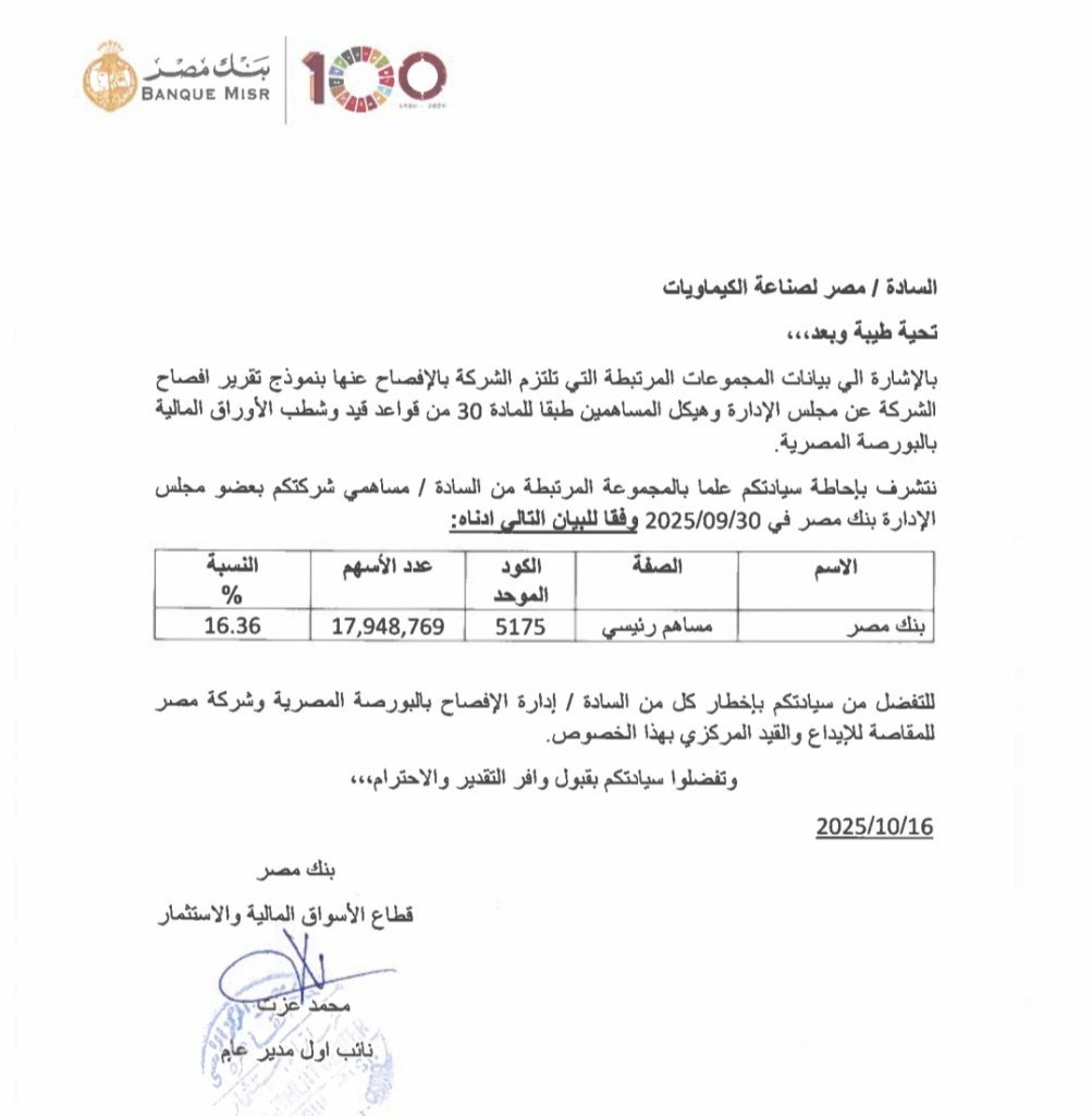 أعلنت شركة مصر لصناعة الكيماويات أن بنك مصر يستحوذ على نحو 16.36% من أسهم رأس مال الشركة، بعدد 17,948,769 سهمًا، وذلك حتى نهاية سبتمبر 2025.