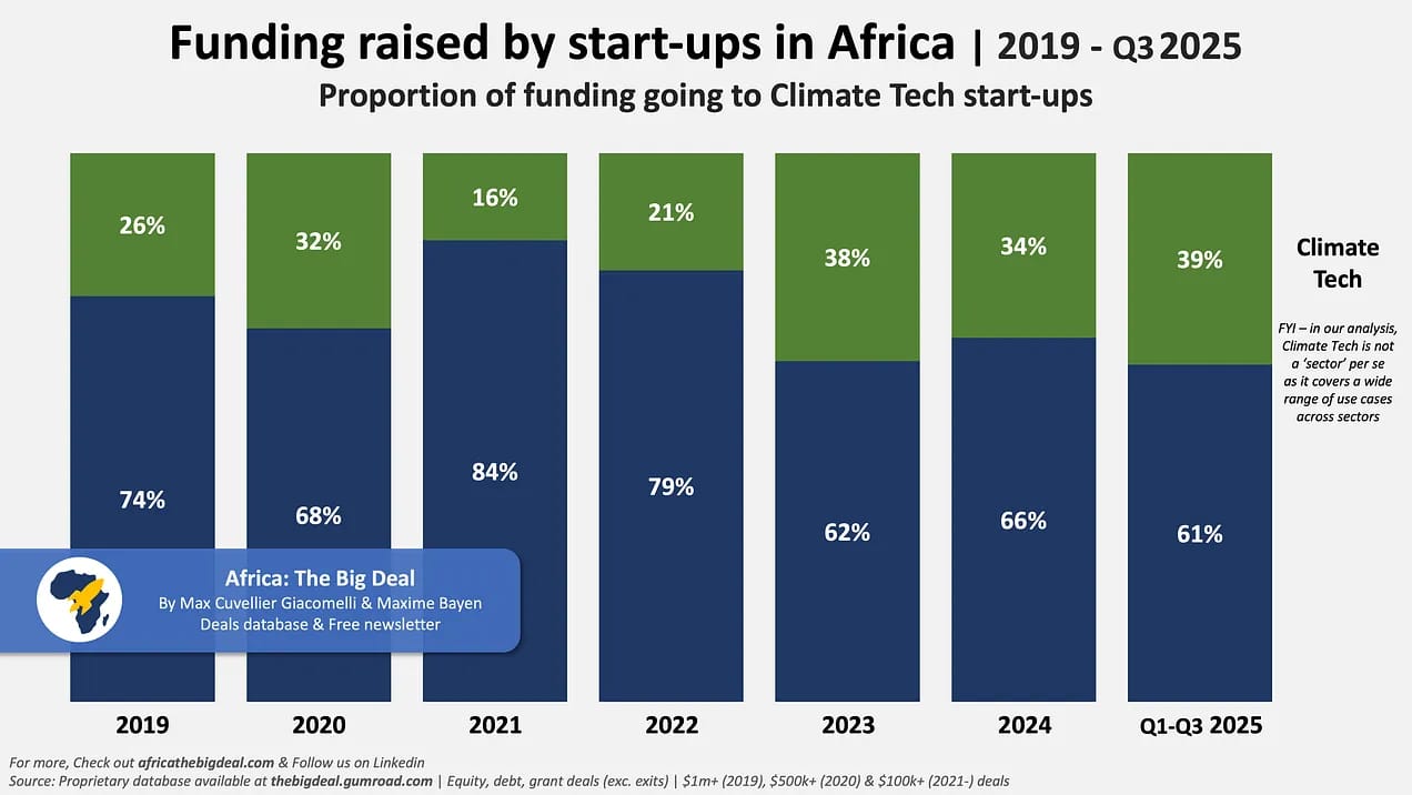كما أدى الأداء القوي لقطاع الطاقة إلى ارتفاع حصة الشركات المصنفة ضمن فئة «التقنيات المناخية» (Climate Tech) إلى 39% من إجمالي التمويل، وهو أعلى مستوى في تاريخ القارة.