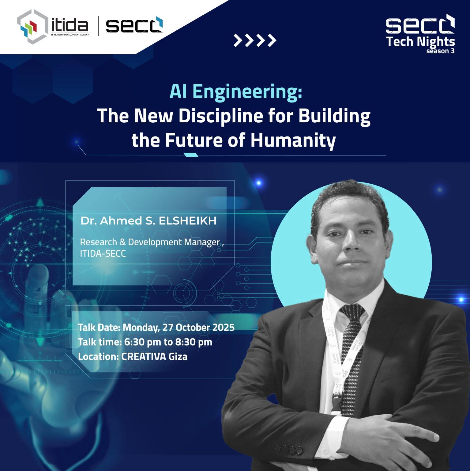 وتستضيف الفعالية الدكتور أحمد س. الشيخ، مدير البحث والتطوير بمركز كفاءة هندسة البرمجيات ITIDA-SECC، الذي سيقدم رؤية متعمقة حول مفهوم هندسة الذكاء الاصطناعي باعتبارها التخصص الجديد الذي يدمج بين هندسة البرمجيات وأنظمة الذكاء الاصطناعي القابلة للتوسع والمسؤولة، ويؤسس لمستقبل يعتمد على حلول رقمية جديرة بالثقة وأخلاقية وآمنة.