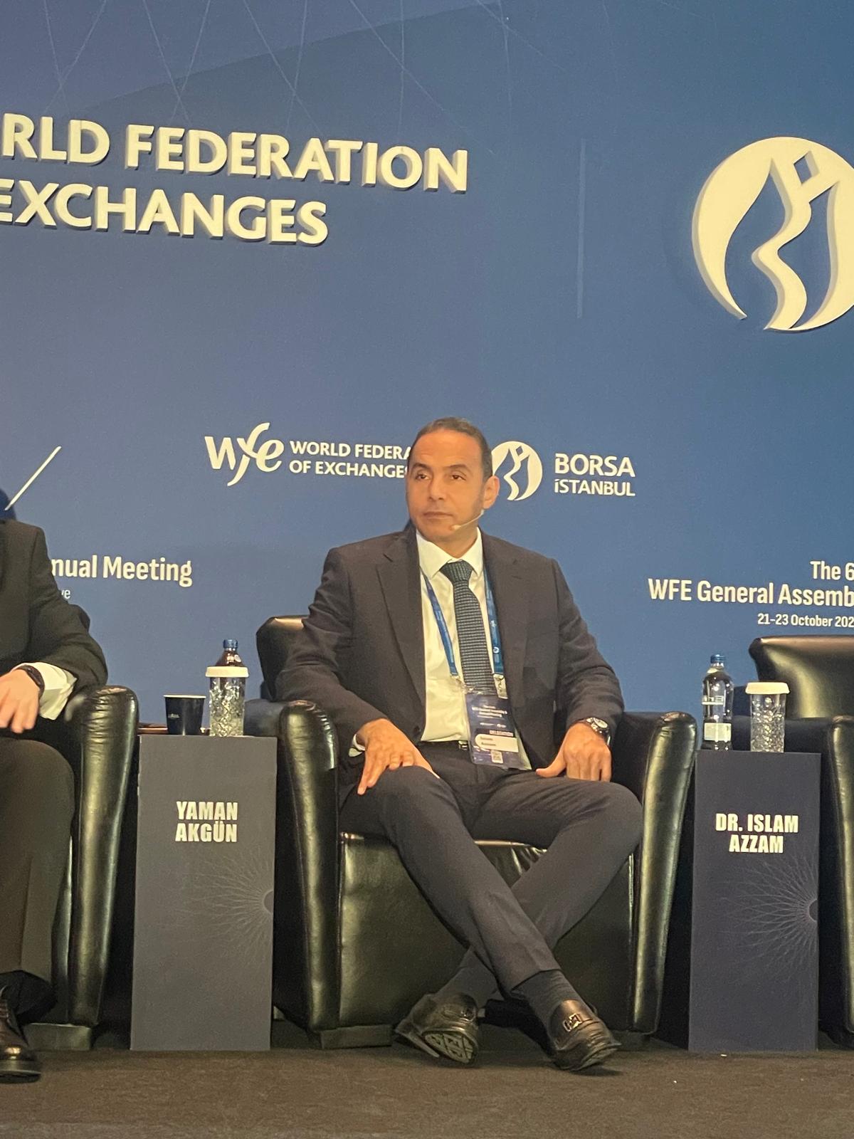 جاء ذلك خلال مشاركة رئيس البورصة المصرية في المؤتمر السنوي والجمعية العامة الرابعة والستين لـ الاتحاد العالمي للبورصات (WFE)، والذي استضافته بورصة إسطنبول بتركيا خلال الفترة من 21 إلى 23 أكتوبر، بمشاركة نخبة من رؤساء ومديري البورصات والمؤسسات المالية العالمية.