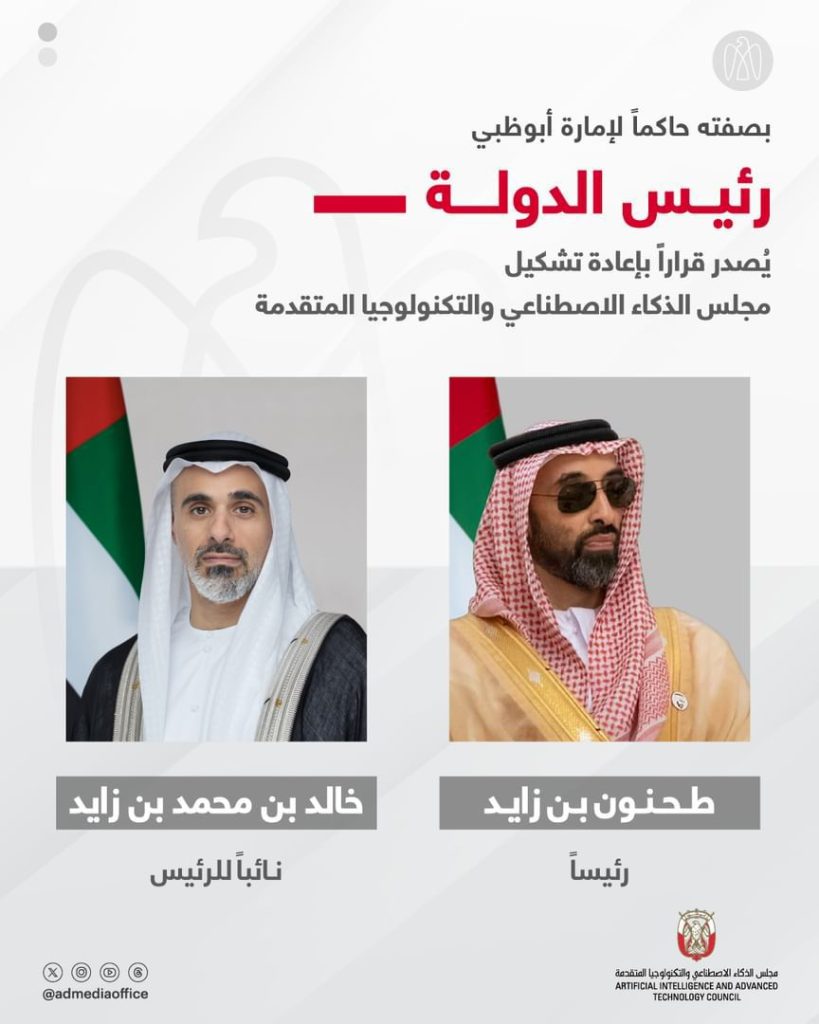 أصدر صاحب السموّ الشيخ محمد بن زايد آل نهيان رئيس الدولة، حفظه الله، بصفته حاكماً لإمارة أبوظبي، قراراً بإعادة تشكيل مجلس الذكاء الاصطناعي والتكنولوجيا المتقدمة، برئاسة سموّ الشيخ طحنون بن زايد آل نهيان، وسموّ الشيخ خالد بن محمد بن زايد آل نهيان نائباً للرئيس.