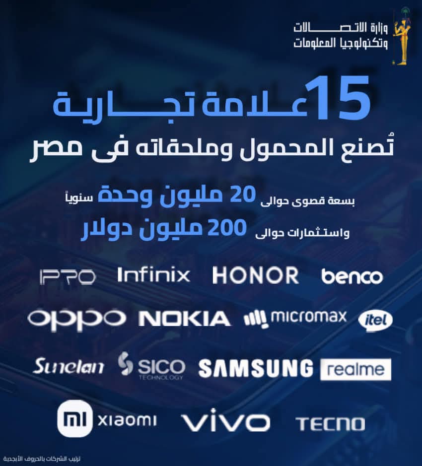 صرح الدكتور عمرو طلعت، وزير الاتصالات وتكنولوجيا المعلومات، بأن مصر نجحت في جذب 15 علامة تجارية لتصنيع الهواتف المحمولة في مصر وملحقاتها، بسعة قصوى تصل إلى نحو 20 مليون وحدة سنوياً، باستثمارات إجمالية تبلغ حوالي 200 مليون دولار.