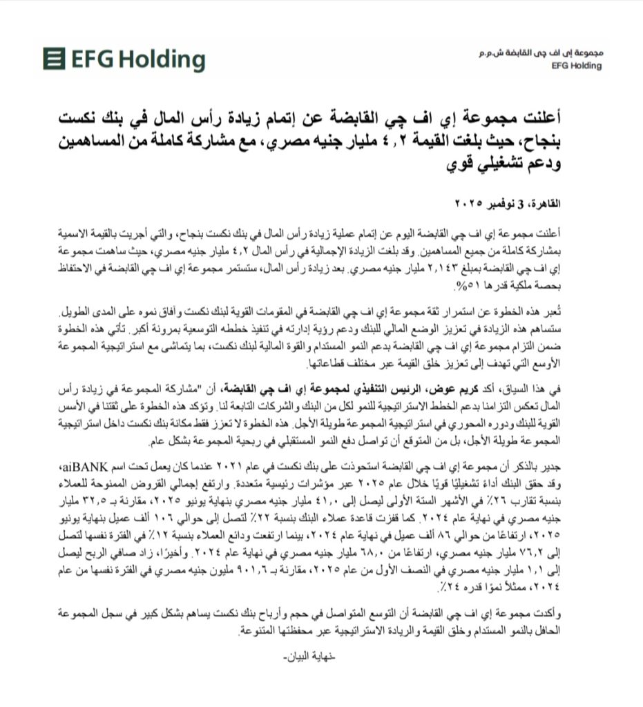 تعبر هذه الخطوة عن استمرار ثقة مجموعة «إي إف جي القابضة» في المقومات القوية لـ«بنك نكست» وآفاق نموه على المدى الطويل.