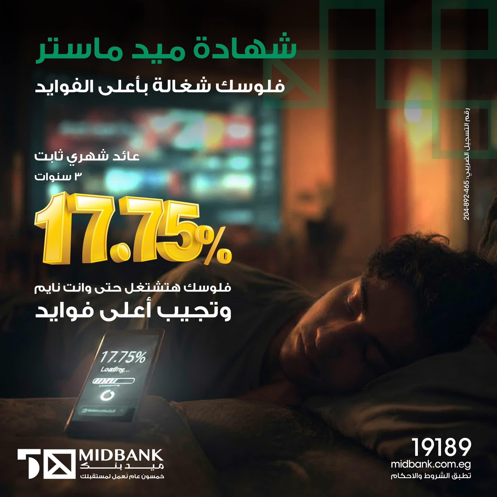 أعلن «ميد بنك» (MIDBANK – مصر) عن طرح شهادة الادخار الجديدة «ميد ماستر». والتي تتيح للعملاء الحصول على عائد دوري ثابت يبلغ 17.75% شهريًا، ضمن باقة شهادات البنك الادخارية بالجنيه المصري.