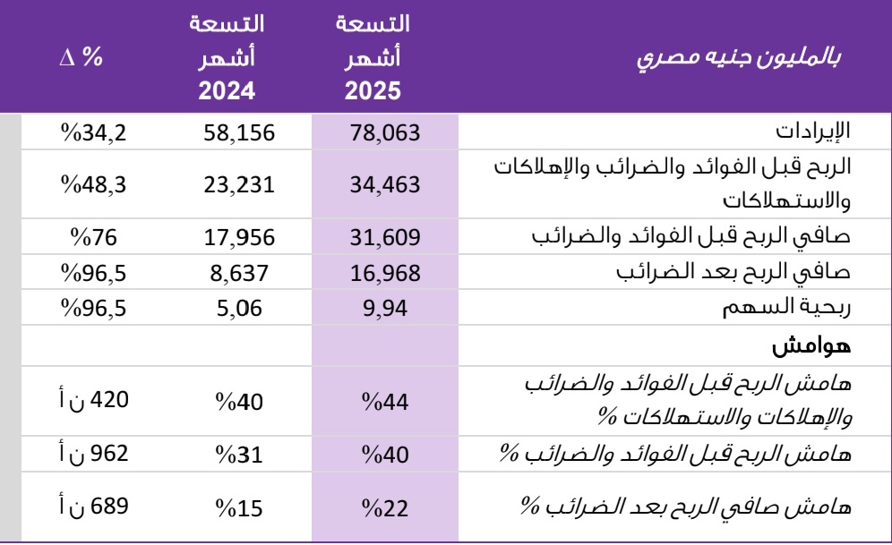 وأضاف المهدي لقد حقق الربح قبل الفوائد والضرائب والإهلاك والاستهلاك نموا قدره 48% مقارنة بنفس الفترة من العام السابق بمبلغ 34.5 مليار جنيه، بفضل النمو القوى في الإيرادات والكفاءة التشغيلية ، ما نتج عنه تحقيق هامش ربح متميز يبلغ 44%، كما أوشك صافي الربح على التضاعف مقارنة بنفس الفترة من العام السابق ليحقق مبلغ 17 مليار جنيه مصري، والذي يعكس قوة الأداء التشغيليشغيلي وحسن إدارة الموارد المالية، لقد أدى استقرار صافي المصروفات التمويلية إلى تخفيف الضغط على صافي الربح وتحقيق مستويات ربحية مرتفعة على الرغم من الضغوط والتحديات الإقليمية.