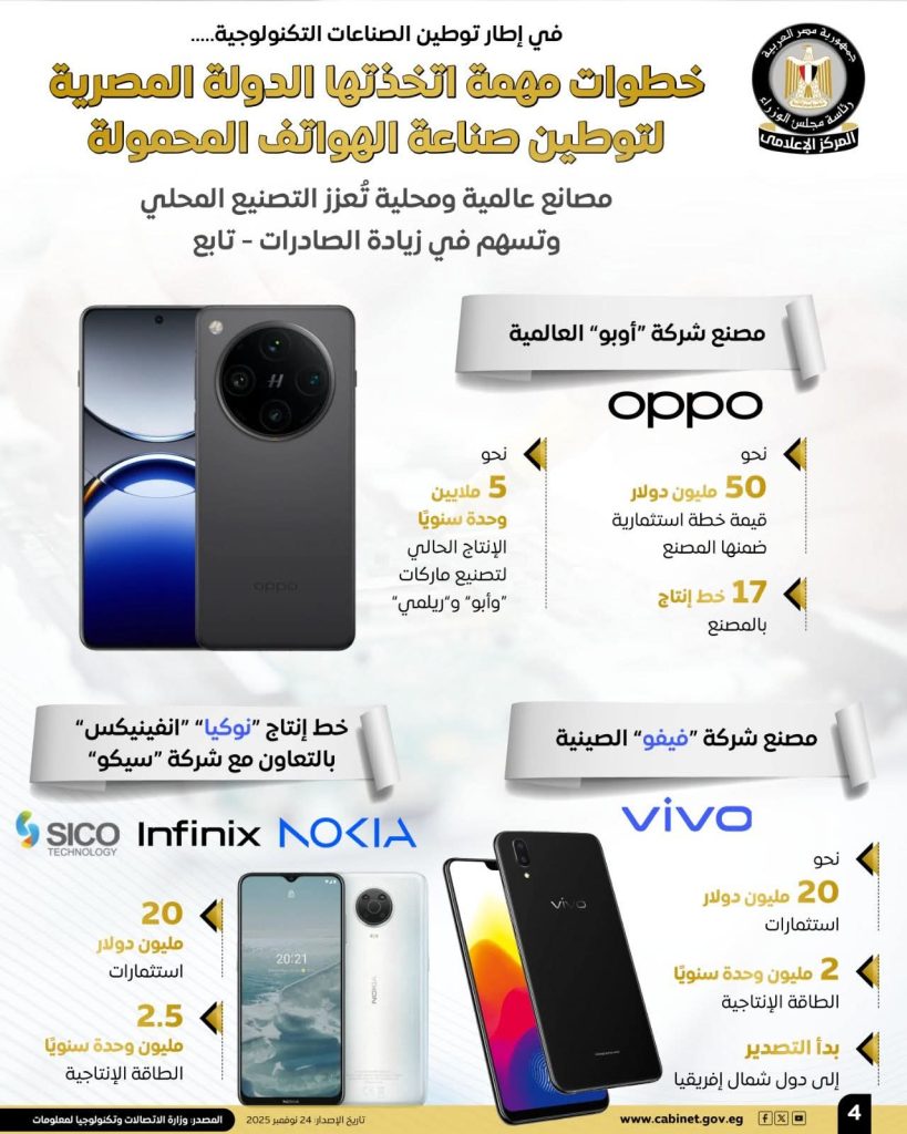نشر المركز الإعلامي لمجلس الوزراء إنفوجرافات عبر منصاته على مواقع التواصل الاجتماعي. سلط من خلالها الضوء على الخطوات التي اتخذتها الدولة لتوطين صناعة الهواتف المحمولة، ضمن جهودها لتوطين الصناعات التكنولوجية.