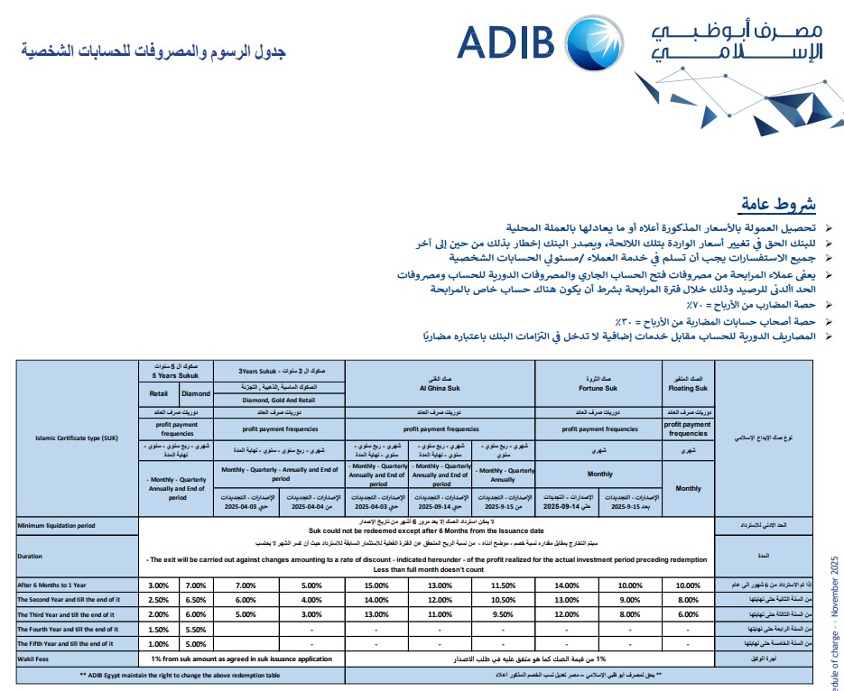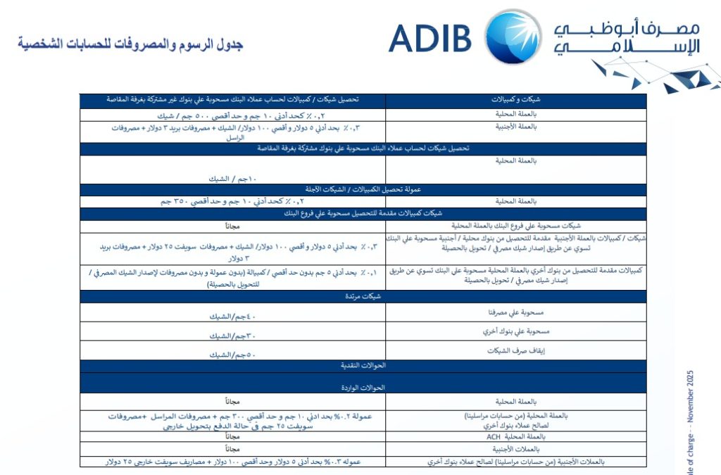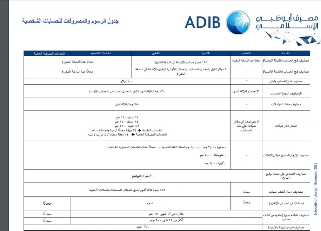أعلن «مصرف أبوظبي الإسلامي–مصر» اليوم الجمعة 28 نوفمبر 2025، عن تعديل جدول الرسوم والمصروفات المعتمد للحسابات الشخصية، في خطوة تعكس توجه البنك إلى إعادة هيكلة تكاليف الخدمات المصرفية بما يتوافق مع متغيرات السوق.
