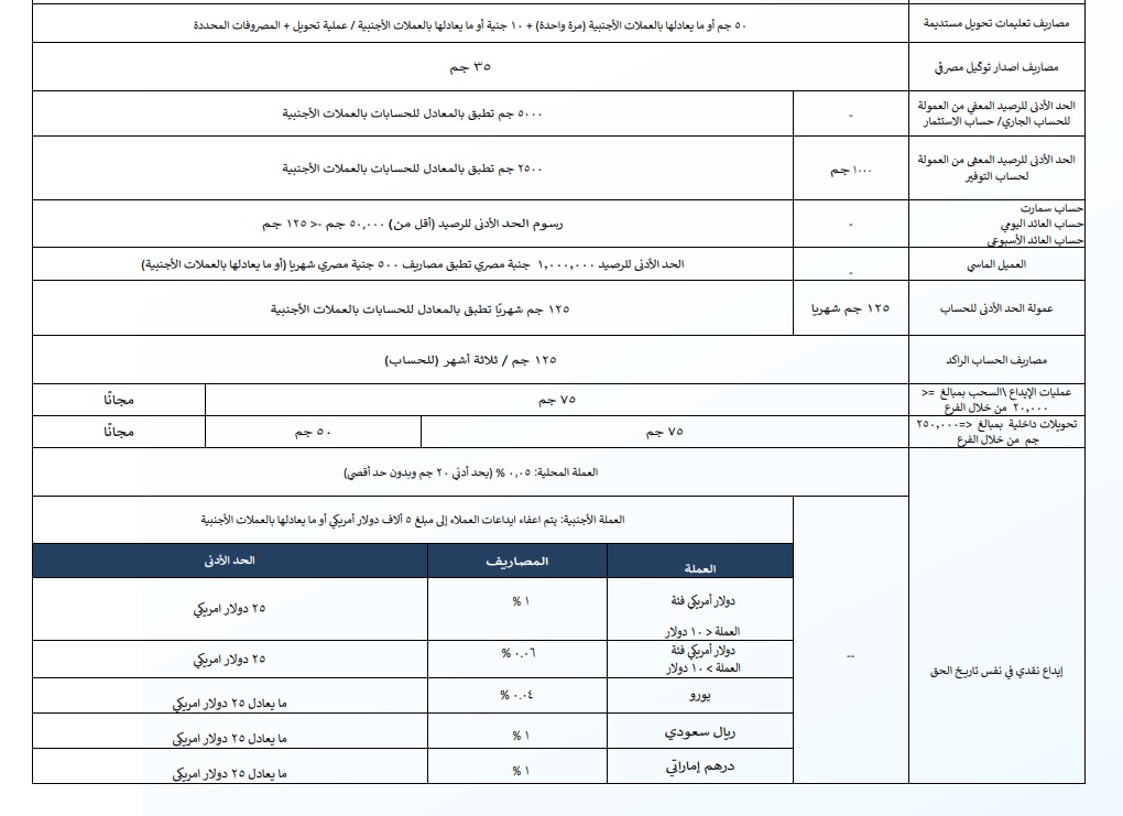 فرض المصرف عمولة الحد الأدنى للحسابات بقيمة 125 جنيه شهريا وتطبق بالمعادل للحسابات بالعملة الأجنبية، فيما تبلغ مصاريف الحساب الراكد 125 جنيه كل 3 أشهر للحساب.