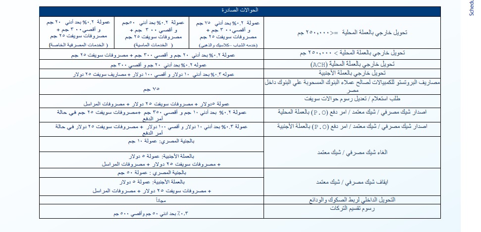 كما تضمنت التحديثات فرض رسم قدره 50جنيهاً على عمليات الإيداع والسحب النقدي التي تقل عن 250,000 جنيه وتتم داخل الفرع للخدمات الماسية وترتفع إلى 75 جنيه لحسابات الشباب وكلاسيك والذهبي.