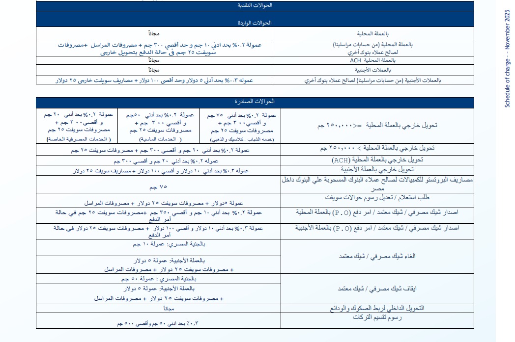 مجانية الحوالات الواردة: أظهر جدول الرسوم الجديد إعفاءً كاملاً للعملاء من مصاريف الحوالات الواردة، سواء كانت بالعملة المحلية أو العملات الأجنبية، وكذلك الحوالات الواردة عبر نظام المقاصة الإلكترونية (ACH)، في المقابل، حدد المصرف رسوماً على الحوالات الواردة من حسابات المراسلين لصالح عملاء بنوك أخرى، حيث تبلغ عمولة العملة المحلية 0.2% (بحد أدنى 10 جنيهات وأقصى 300 جنيه) ، بينما تبلغ عمولة العملات الأجنبية 0.3% (بحد أدنى 5 دولارات وأقصى 100 دولار)، يُضاف إليها مصاريف السويفت والمراسل.