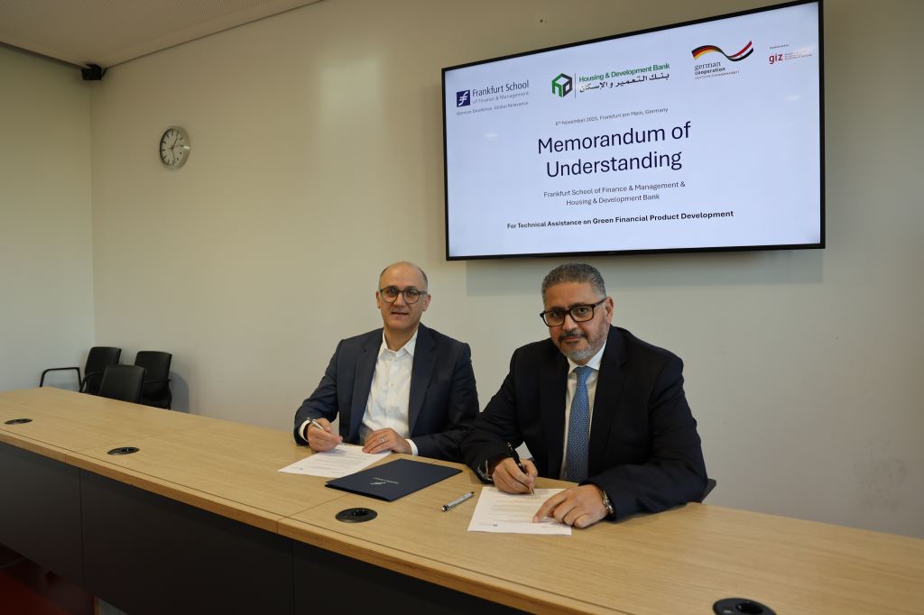 في خطوةٍ جديدة تعكس التزام بنك التعمير والإسكان بتطبيق أفضل الممارسات المستدامة، وتفعيلاً لاستراتيجية البنك (2025–2030) التي تضع الاستدامة محوراً رئيسياً في خططه المؤسسية. وقع البنك مذكرة تفاهم مع مدرسة فرانكفورت للإدارة والتمويل ، تحت رعاية الوكالة الألمانية للتعاون الدولي (GIZ). وذلك ضمن مبادرة “بناء القدرات الخضراء” (GREET) المموَّلة من وزارة التعاون الاقتصادي والتنمية الألمانية (BMZ). وتهدف هذه الشراكة إلى تطوير منتجات تمويلية خضراء مبتكرة وتعزيز قدرات البنك المؤسسية في مجال التمويل المستدام.