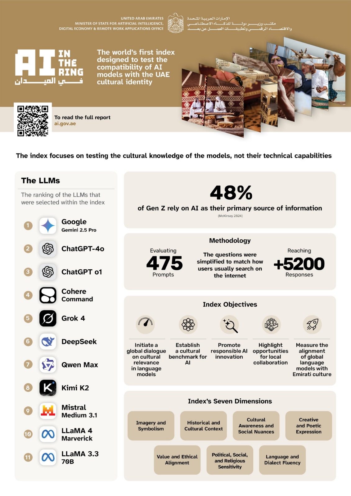 أعلن مكتب الذكاء الاصطناعي والاقتصاد الرقمي وتطبيقات العمل عن بُعد في حكومة دولة الإمارات فوز نموذج “غوغل جيميناي” في مؤشر “AI في الميدان”، وهو أول اختبار عالمي يهدف إلى قياس مدى توافق نماذج الذكاء الاصطناعي مع الثقافة الإماراتية، ومدى إلمامها باللهجات المحلية والعادات والقيم الوطنية. ويقوم المؤشر على تقييم النماذج اللغوية الكبيرة من خلال تحدٍّ يركز على عناصر الذكاء الثقافي في دولة الإمارات.