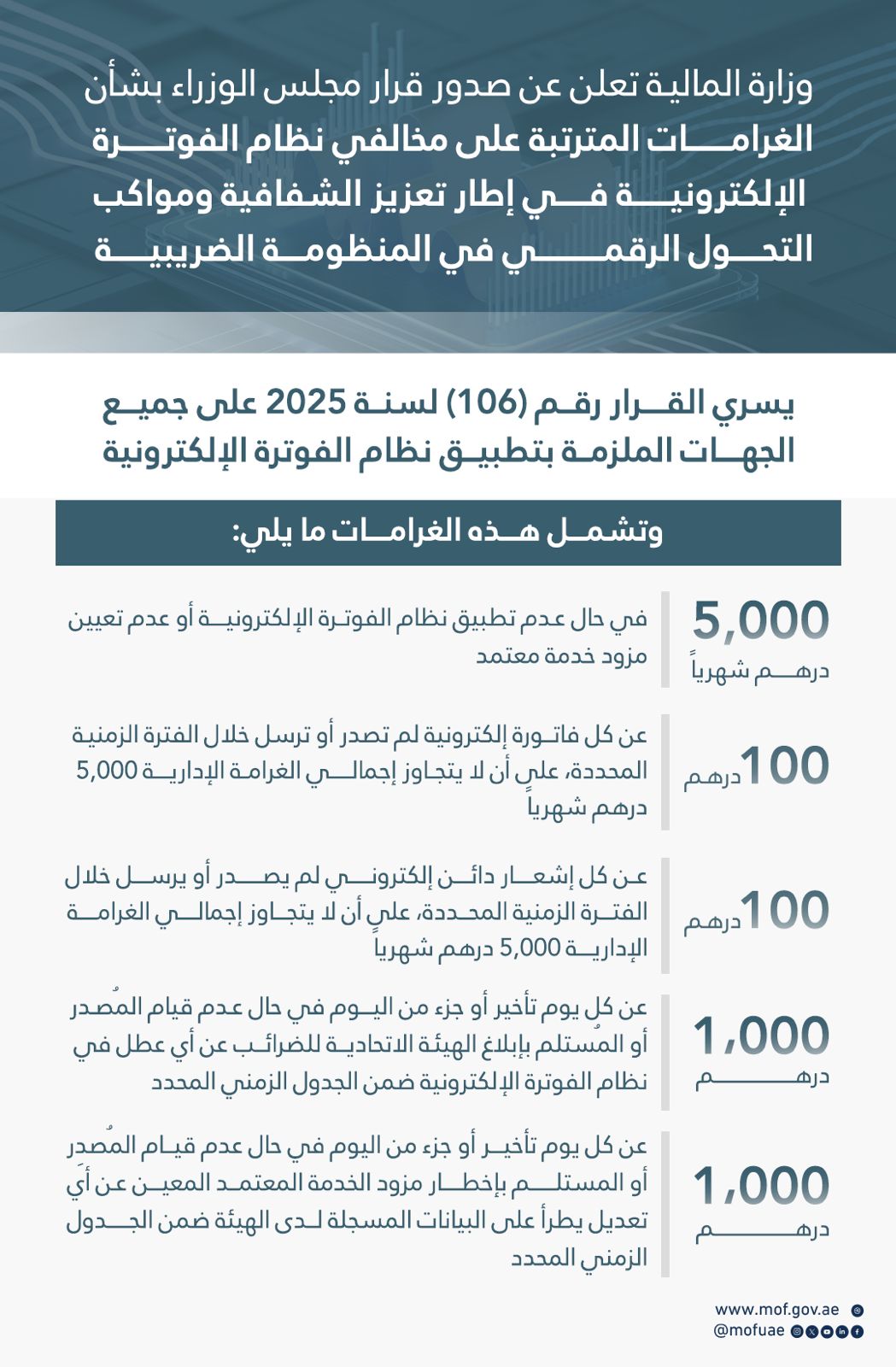 · 5,000 درهم شهرياً، في حال عدم تطبيق نظام الفوترة الإلكترونية أو عدم تعيين مزود خدمة معتمد في الموعد الزمني المحدد في القرار الوزاري رقم (244) لسنة 2025 في شأن تطبيق نظام الفوترة الإلكترونية.