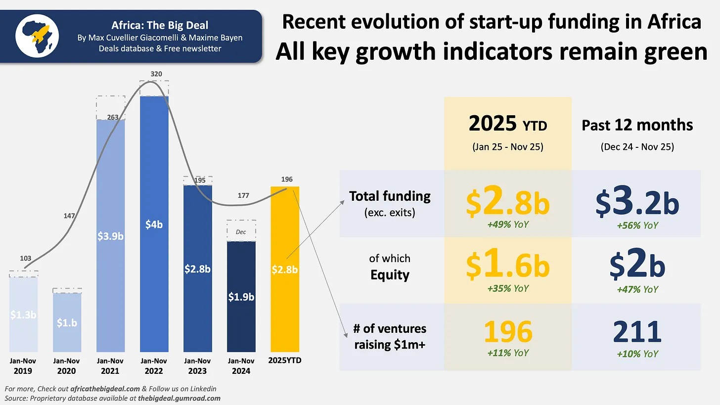 سجّل نوفمبر 2025 أداءً متوسطًا على مستوى تمويل الشركات الناشئة في إفريقيا، لكنه حمل حدثًا استثنائيًا لم تشهده القارة منذ ما قبل الجائحة. فقد أعلنت الشركات الناشئة عن جمع 162 مليون دولار خلال الشهر (باستثناء صفقات الاستحواذ)، بينما جاء معظم التمويل عبر جولات أسهم شكّلت 79% من الإجمالي. ورغم أن الرقم لا يمثّل ذروة في الأداء السنوي، فإنه يضع الشهر في المرتبة الخامسة من حيث حجم التمويل منذ بداية 2025، كما يقترب من مستوى نوفمبر 2024 البالغ 181 مليون دولار، ويظل أقل بكثير من مستوى نوفمبر 2023 البالغ 267 مليون دولار.