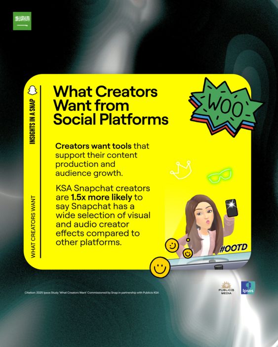 عقدت سناب شات، بالتعاون مع شركتي بوبليسيس ميديا الشرق الأوسط وإبسوس، دراسةً جديدة في المملكة العربية السعودية لفهم ما يريده صناع المحتوى من منصات التواصل الاجتماعي والعلامات التجارية ومتابعيهم. وتناولت الدراسة طريقة تعامل صناع المحتوى مع مختلف المنصات التي ينشرون عليها، والأدوات التي يستخدمونها. وما يطلبونه من شراكات العلامات التجارية، وكيف ينظرون إلى جمهورهم.