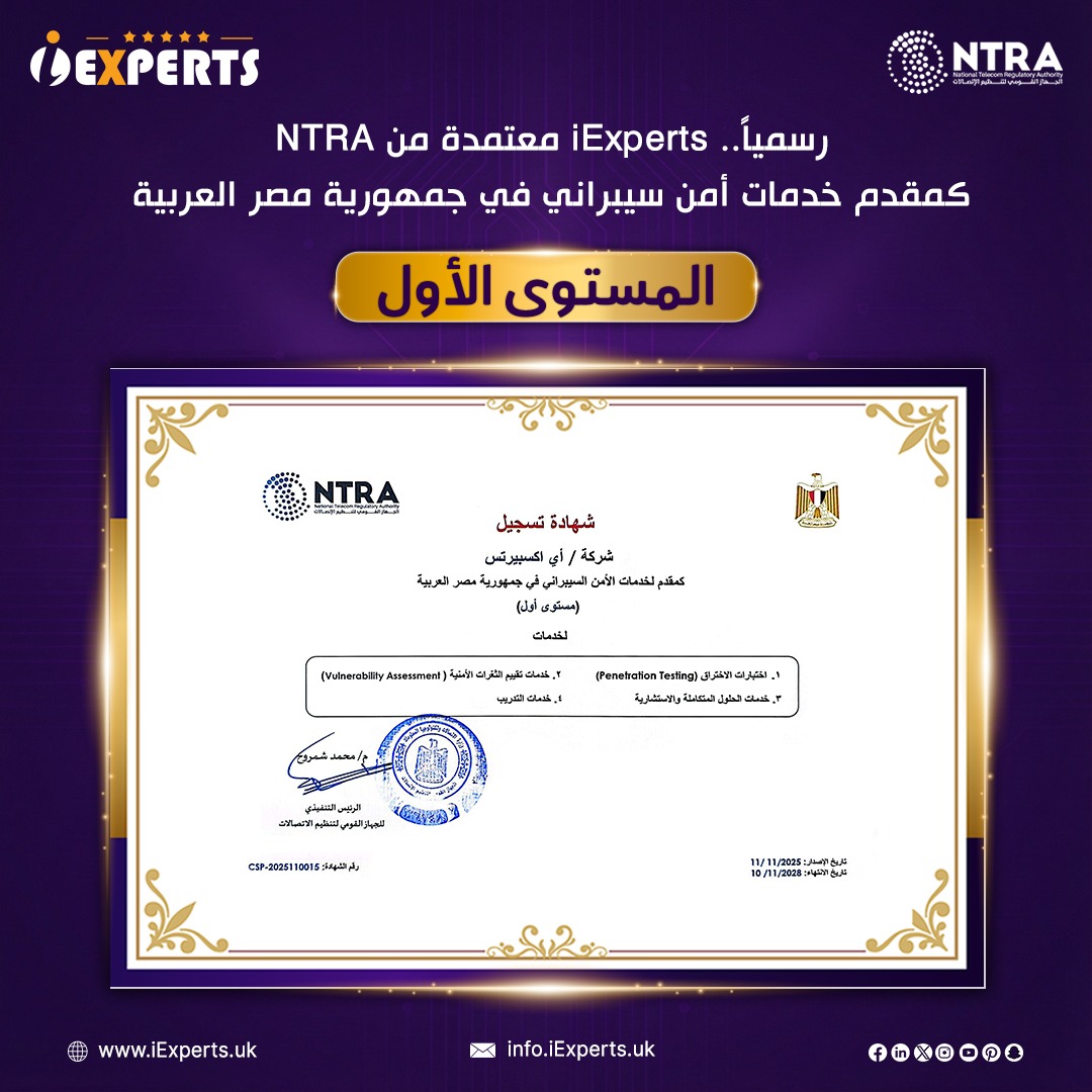 الصفحة الرئيسية أخبار«الجهاز القومي لتنظيم الاتصالات» يمنح «iExperts» ترخيص مقدم خدمات الأمن السيبرانى من المستوى الأول في مصر