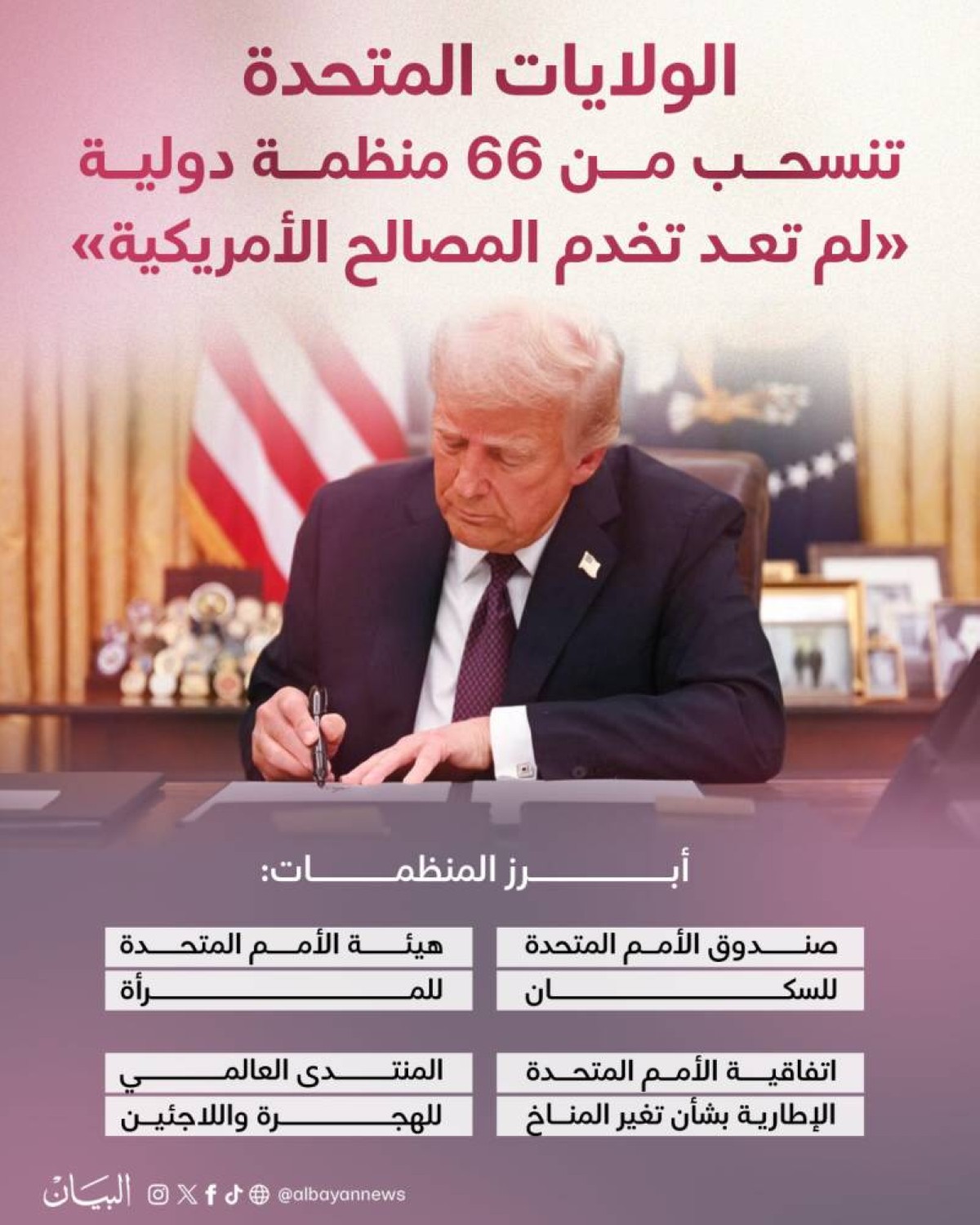قال الرئيس الأمريكي دونالد ⁠ترامب يوم الأربعاء إن الولايات المتحدة ستنسحب من 66  منظمات دولية وهيئات التابعة للأمم المتحدة، بما ‌في ذلك معاهدة مناخية رئيسية وهيئة تابعة للأمم المتحدة تعنى بتعزيز المساواة بين الجنسين وتمكين المرأة، لأنها “تتعارض مع المصالح الوطنية الأمريكية”.